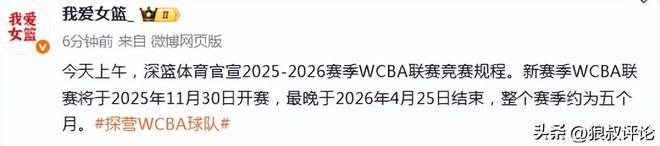 北京时间10月13日,根据媒体人“我爱女篮”的报道,今天上午,深篮体育官宣2025-2026赛季WCBA联赛竞赛规程。新赛季WCBA联赛将于2025年11月30日开赛,最晚于2026年4月25日结束,整个赛季约为五个月。