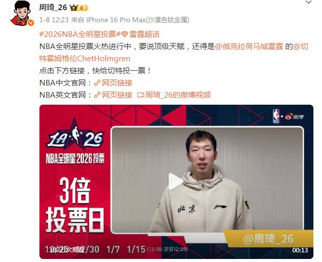 周琦先是在1月8日给同为“竹竿人”的雷霆总冠军球员霍姆格伦拉票,周琦拍摄视频拉票,同时还写道:“NBA全明星投票火热进行中,要说顶级天赋,还得是@俄克拉荷马城雷霆 的@切特霍姆格伦ChetHolmgren。”