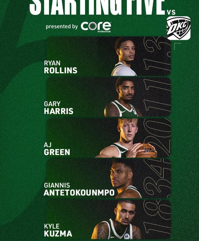 首发阵容方面,雷霆队这边,阿龙-威金斯(腹股沟酸痛)与杰威(臀大肌挫伤)确定缺阵,卡鲁索、哈尔滕施泰因也不打,主帅排出的最新首发五人组为:谢伊-吉尔杰斯-亚历山大、卡森-华莱士、阿杰伊-米切尔、吕冈茨-多尔特、切特-霍姆格伦;雄鹿队这边,迈尔斯-特纳和小凯文-波特缺战,首发阵容则为:扬尼斯-阿德托昆博、莱恩-罗林斯、加里-哈里斯、AJ-格林、凯尔-库兹马。