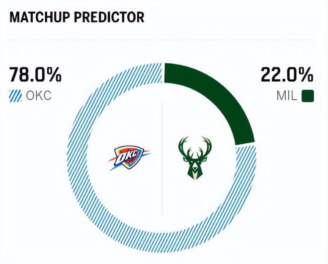 赛前,美媒ESPN对本场比赛进行了胜率预测,雷霆队胜率依旧高达78.0%,占据绝对上风,雄鹿胜率则仅有22.0%,还是不被看好。