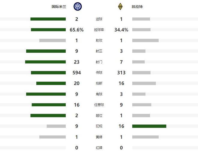 第19分钟比塞克又摔倒在了客队禁区,主裁判第一时间判罚点球,但回看VAR后点球又被取消,场面上略显被动的阿拉木图凯拉特第43分钟差点打破场上平衡,萨特帕耶夫大禁区前沿的远射击中门框被弹出,逃过一劫的蓝黑军团,在半场结束前终于取得进球,劳塔罗乱战中在对方禁区完成两连击,帮助国米带着1-0的优势,回到了中场更衣室。