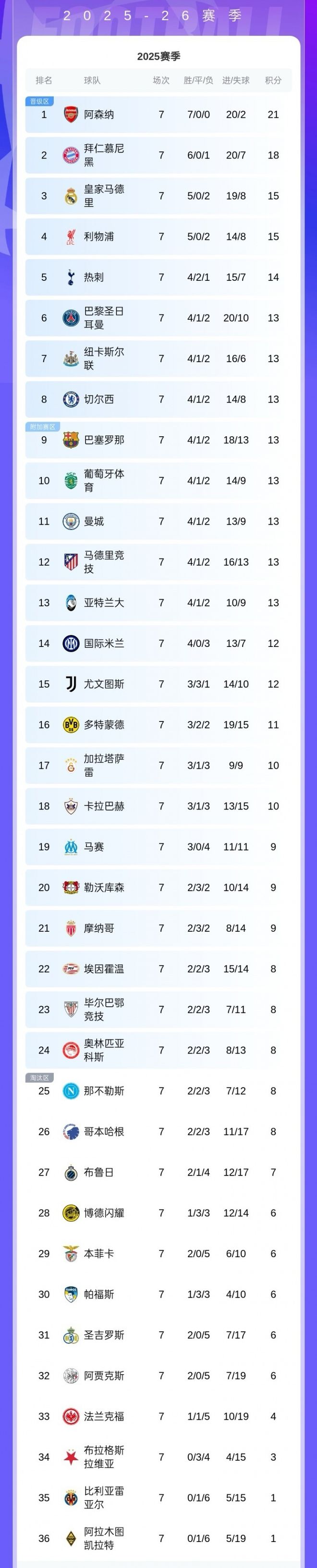除了这两支提前锁定优势的球队外,皇马、利物浦、热刺、巴黎、纽卡、切尔西也暂时跻身直接晋级区,占据了当前直通16强的剩余席位。