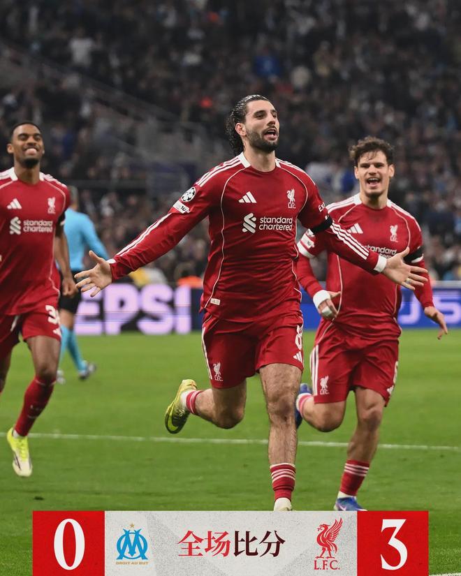 韦洛德罗姆球场的夜风凛冽,但对于利物浦而言,这是一场及时而必要的胜利——3-0击败马赛,索博斯洛伊的贴地斩、弗林奔造的乌龙、加克波的锁定胜局,让红军在欧冠积分榜上跃升至前八,距直接晋级淘汰赛仅一步之遥。