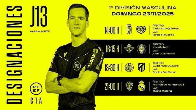 西班牙足协官方公布了周日西甲4场比赛的裁判安排,弗朗西斯科-埃尔南德斯将执法皇马客战埃尔切。