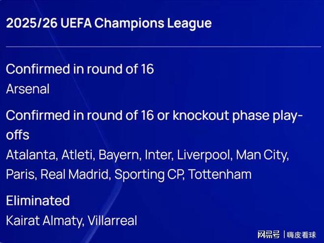 另外,英超的热刺、曼城和利物浦,西甲的皇家马德里和马德里竞技,意甲的亚特兰大和国际米兰,德甲的拜仁慕尼黑,法甲的巴黎圣日耳曼,葡超的葡萄牙体育,这10支球队,已经获得出线权,至少确保可以参加16强附加赛。