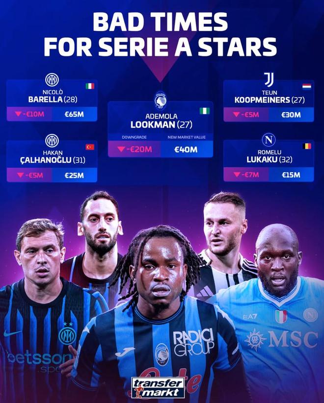 北京时间10月7日,在更新了意甲球员的身价之后,德转也统计出了此次身价跌幅最高的10名球员,卢克曼身价下跌2000万欧元跌幅最大,劳塔罗、巴雷拉、迪马尔科、弗拉霍维奇以及恩昆库全都下跌1000万欧元。