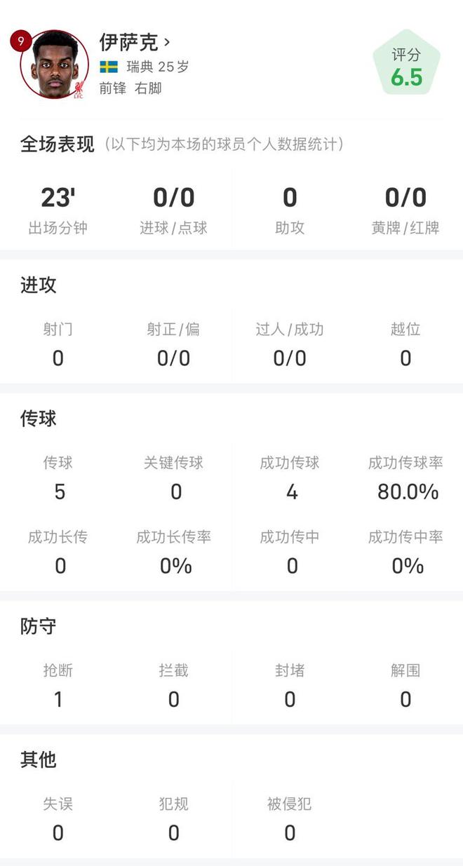 雷速体育9月20日讯 英超第5轮,利物浦主场2比击败埃弗顿。利物浦前锋伊萨克替补出场23分钟,拿球机会不多。