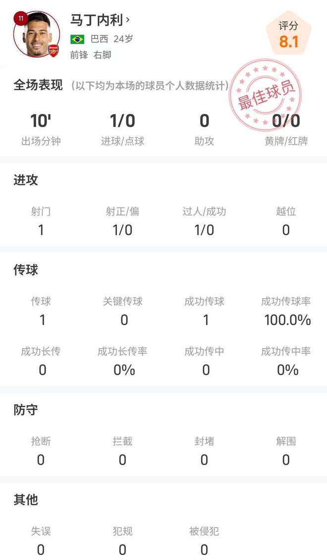 雷速体育9月22日讯 英超第5轮,阿森纳坐镇主场1-1战平曼城,马丁内利替补登场并帮助枪手打进绝平进球。