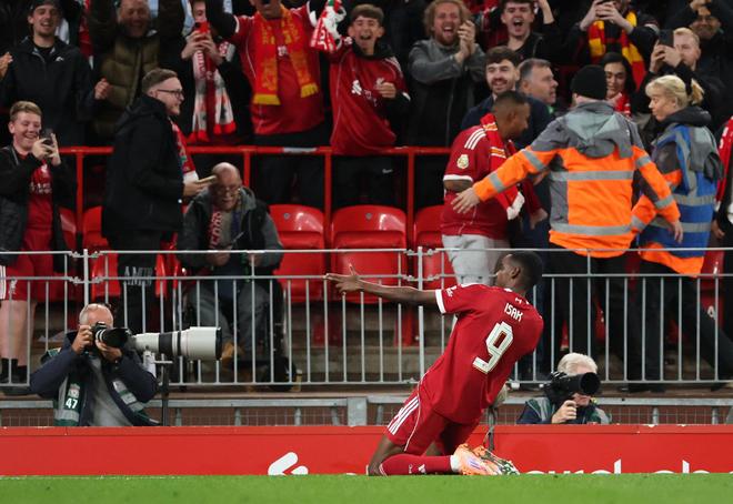 雷速体育9月24日讯 在今日凌晨英联杯第三圈利物浦对阵南安普顿的比赛中,利物浦前锋伊萨克在上半场比赛第43分钟,接基耶萨的倒三角助攻,推射收获利物浦生涯的首粒进球。
