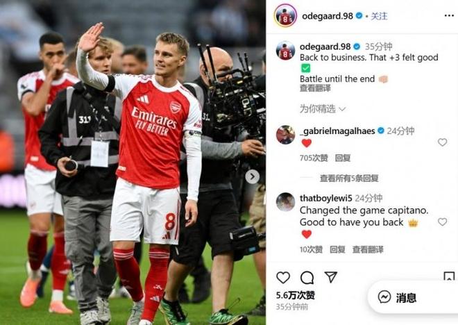 他还笑着表示,“终场绝杀就是足球最棒的时刻,能和队友一起拿下这场胜利,再完美不过”。而阿森纳队长厄德高也通过社交媒体分享喜悦,一句 “回到胜轨,这 3 分拿得真棒,战斗到底”,既传递了球队的士气,也呼应了整场比赛的拼搏精神。