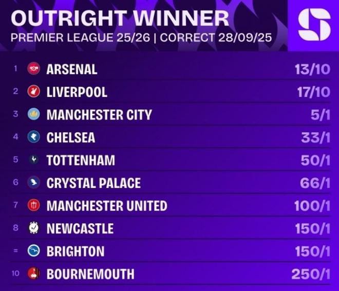 这场逆转不仅左右了两队的近期走势,更直接影响了英超冠军的争冠格局。赛后,有关机构更新的英超冠军赔率显示,阿森纳以 13/10 的赔率升至榜首,力压 17/10 的利物浦与 5/1 的,成为本赛季争冠的最大热门之一。