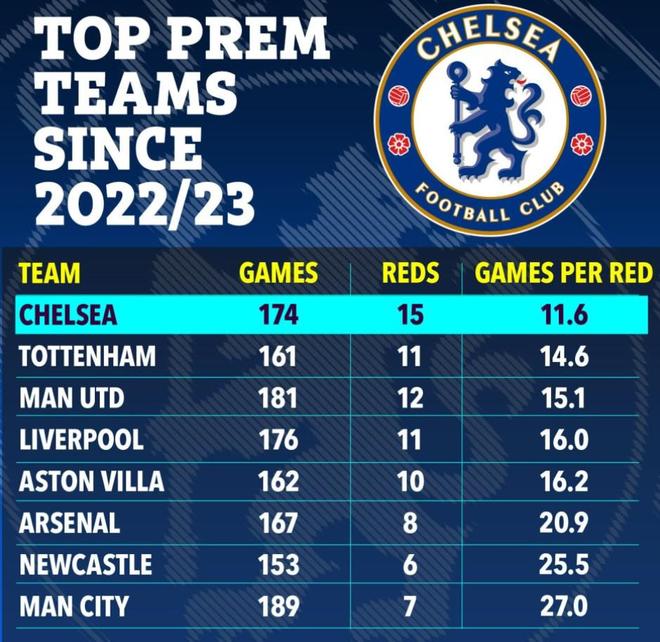 《太阳报》统计的数据显示,自2022-23赛季以来,切尔西在英超顶级俱乐部中的红牌纪录最为糟糕。