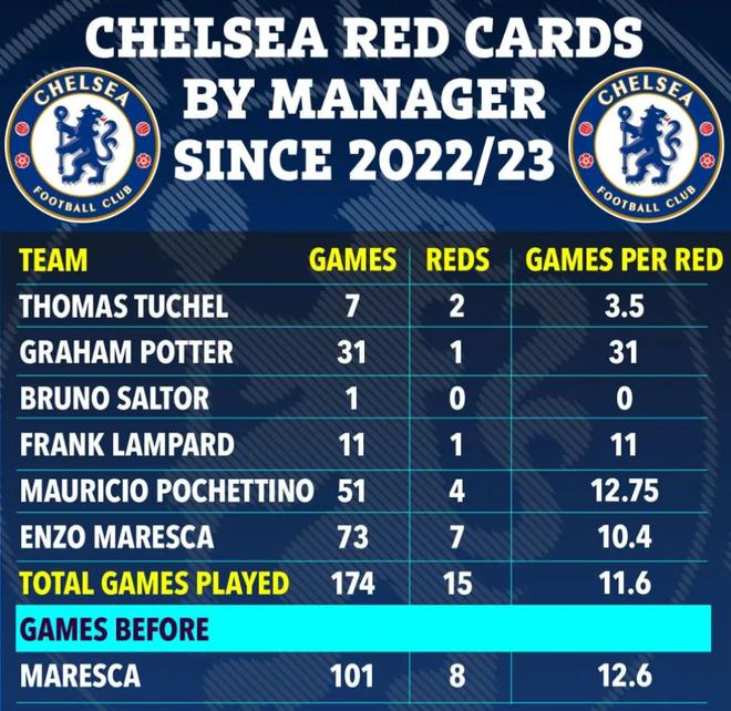 马雷斯卡执教切尔西至今,73场比赛中共出现7张红牌,平均每10.4场就有1人被罚下。