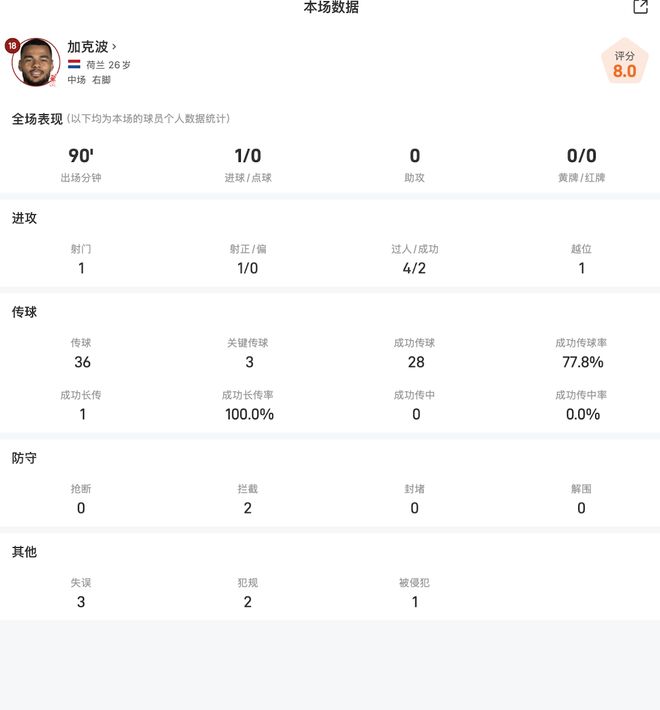 防守方面贡献2次拦截,另外有3次失误和2次犯规。