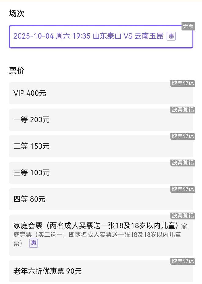 购票平台上,泰山VS云南玉昆所有球票都显示“缺货登记”状态。