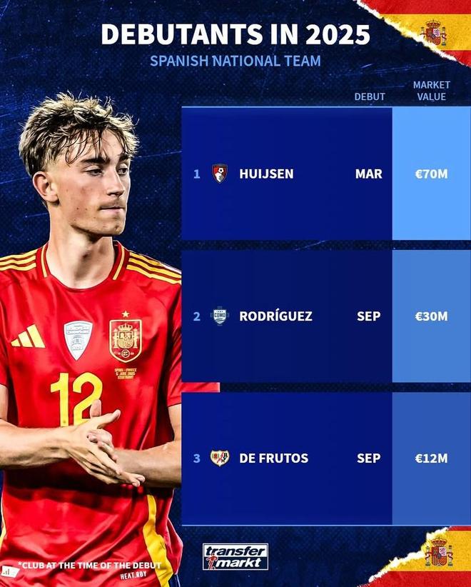 北京时间10月16日,德转列出了2025年完成西班牙国家队首秀的球员,今年到目前为止德拉富恩特仅给了三名球员完成国家队首秀的机会,今夏转会皇家马德里的赫伊森领衔。