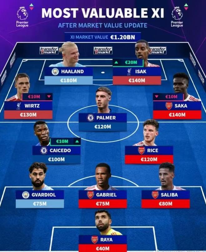 雷速体育10月18日讯 德国转会市场于近日更新了英超联赛的球员市值,并列出了一个阵型为3-5-2的最贵11人阵容。在这个总身价高达12亿欧元的阵容中,阿森纳有5名球员入选,切尔西、利物浦、曼城则分别有2人入选。