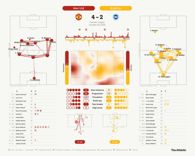虽然这场比赛曼联并不像在安菲尔德那样频繁采用长传推进——拉门斯本场只开出了34脚长传,而非此前的45脚——但球队依然延续了本赛季标志性的快节奏、直接的风格。这支从上赛季还在为后场组织发愁的球队,如今已能迅速而高效地将球推进到对方半场。
