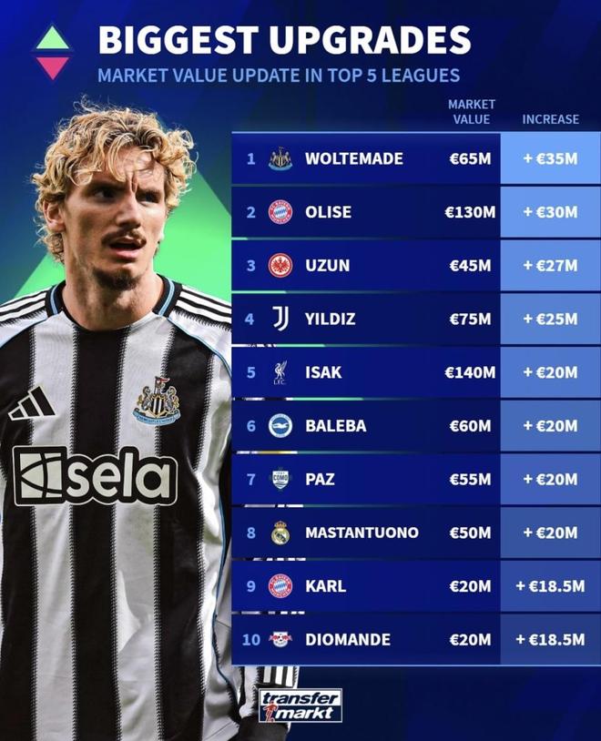 从联赛看:这份涨幅榜更像“德甲+英超双引擎”。英超3人、德甲4人、意甲2人、西甲1人。英超贡献最高绝对身价(如1.3亿、1.4亿区间),体现商业与转播红利,对成熟球员的终端定价最强;而德甲贡献最多的“涨幅席位”,说明其培养+上场机会更友好,成为年轻球员加速增值的通道。意甲与西甲更多聚焦具天赋的少数个案,涨幅虽大但样本更小。