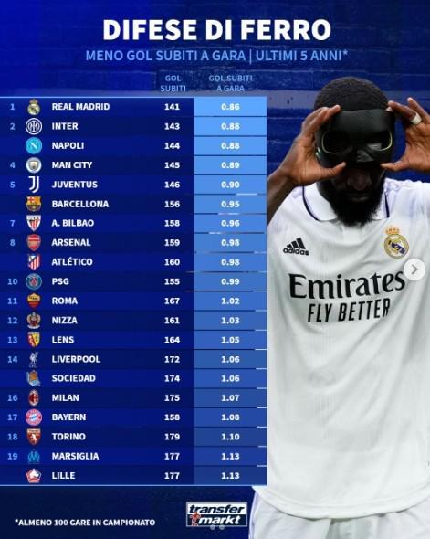 当地时间11月14日,德国转会市场在社交媒体上发布了近5年五大联赛各家俱乐部的场均失球榜,并列出场均失球最少榜单(至少参加100场联赛)。