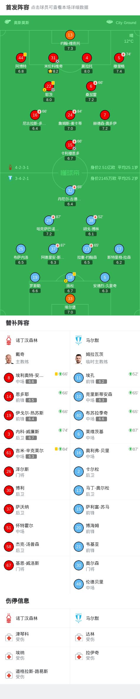 第44分钟,再下一城,卡利穆恩多禁区补射破门,诺丁汉森林2-0