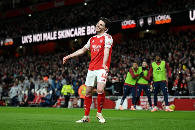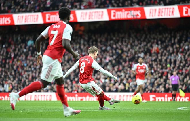 第14分钟,赖斯中场断球,萨卡右路突破,禁区附近低平球传中,厄德高停球稍作调整,随后起脚扫射,皮球从右下角钻入网窝,阿森纳打破僵局,1-0!
