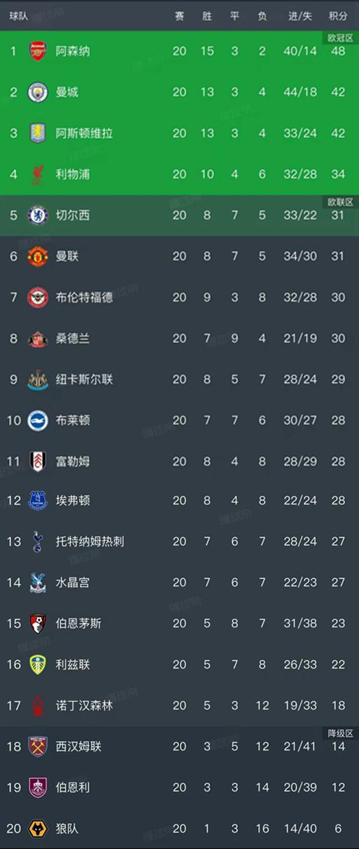曼城遭遇两连平,积分上涨到42分,已经落后枪手6分,而且积分和阿斯顿维拉持平。蓝军同样是两连平,而且连续4轮不胜,以31分暂列第5名,已经把前三名拉开了分差,冲击第四名争抢欧冠门票更加务实。阿斯顿维拉本轮在主场3-1战胜了诺丁汉森林,避免了连败。
