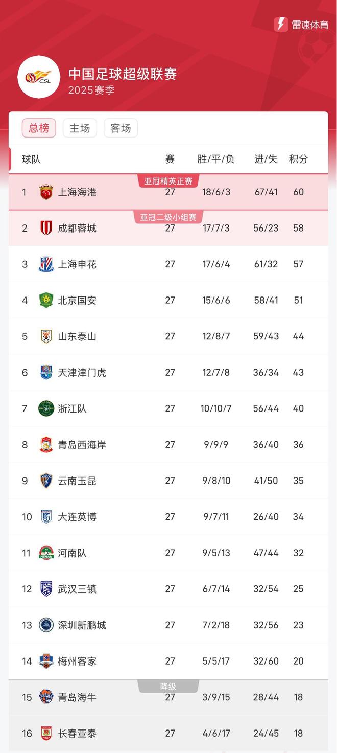 雷速体育10月19日讯 随着长春亚泰客场0-2不敌河南队,中超联赛第27轮全部赛程结束,上海海港在本轮以4-3险胜青岛海牛,积60分以2分优势继续领跑积分榜,蓉城、申花本轮有惊无险取胜紧随其后,北京国安换帅后不敌保级队深圳新鹏城,彻底掉出争冠行列。青岛海牛、长春亚泰本轮均输球,两队同积18分深陷降级区。