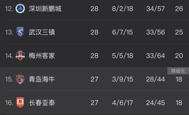 取得2连胜后,新鹏城积分来到26分,超越了25分的三镇,升至倒数第5位。尽管两队目前都还没有确定保级成功,但形势却相当乐观。