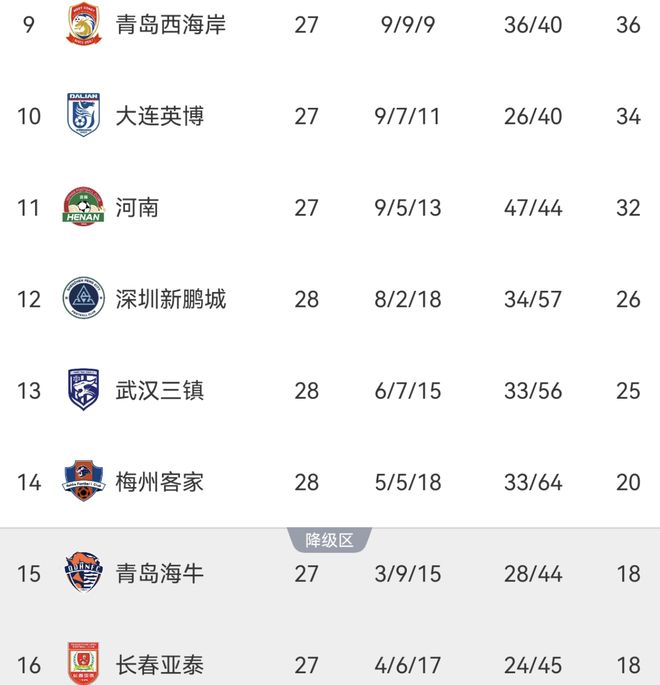 在本轮比赛之前,河南32分,三镇25分,新鹏城23分,梅州20分,海牛、亚泰同积18分,排在第11-16位。还剩3轮,根据如此积分形势看,排名后5位的球队都有可能降级,尤其是后3名队伍。