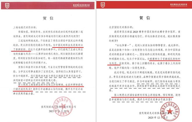 不管是中超冠军还是足协杯冠军,都有机会出战亚冠精英赛。对此在贺电的最后一段,重庆铜梁龙的期待有所不同。对于将踢正赛的海港是祝愿他们“在亚洲赛场展现中国足球的风采”;对于要踢资格赛的北京国安,却对亚冠只字不提。