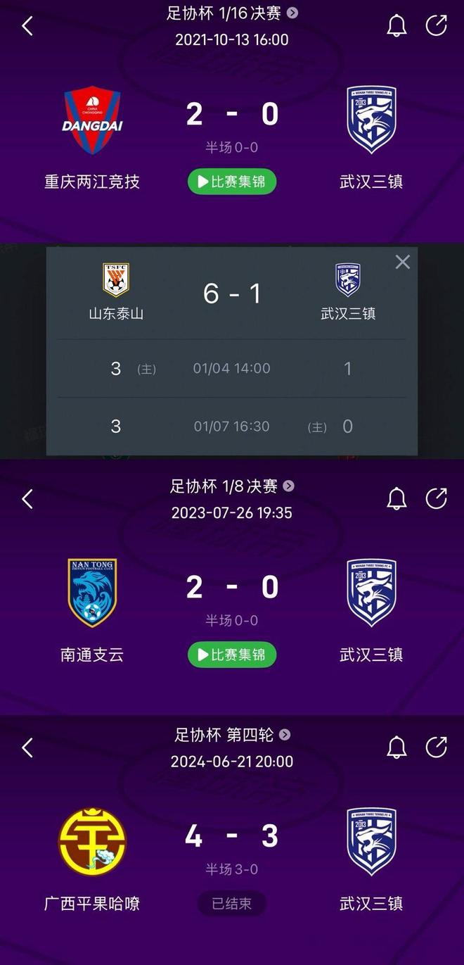 2021赛季足协杯,重庆两江竞技2-0淘汰了武汉三镇,后来解散了。2022赛季,山东泰山两回合总比分6-1淘汰武汉三镇,虽然没解散,烂事不少。2023赛季足协杯,南通支云2-0淘汰了武汉三镇,降级中甲。2024赛季足协杯,广西平果哈嘹4-3淘汰武汉三镇,目前没有过审。